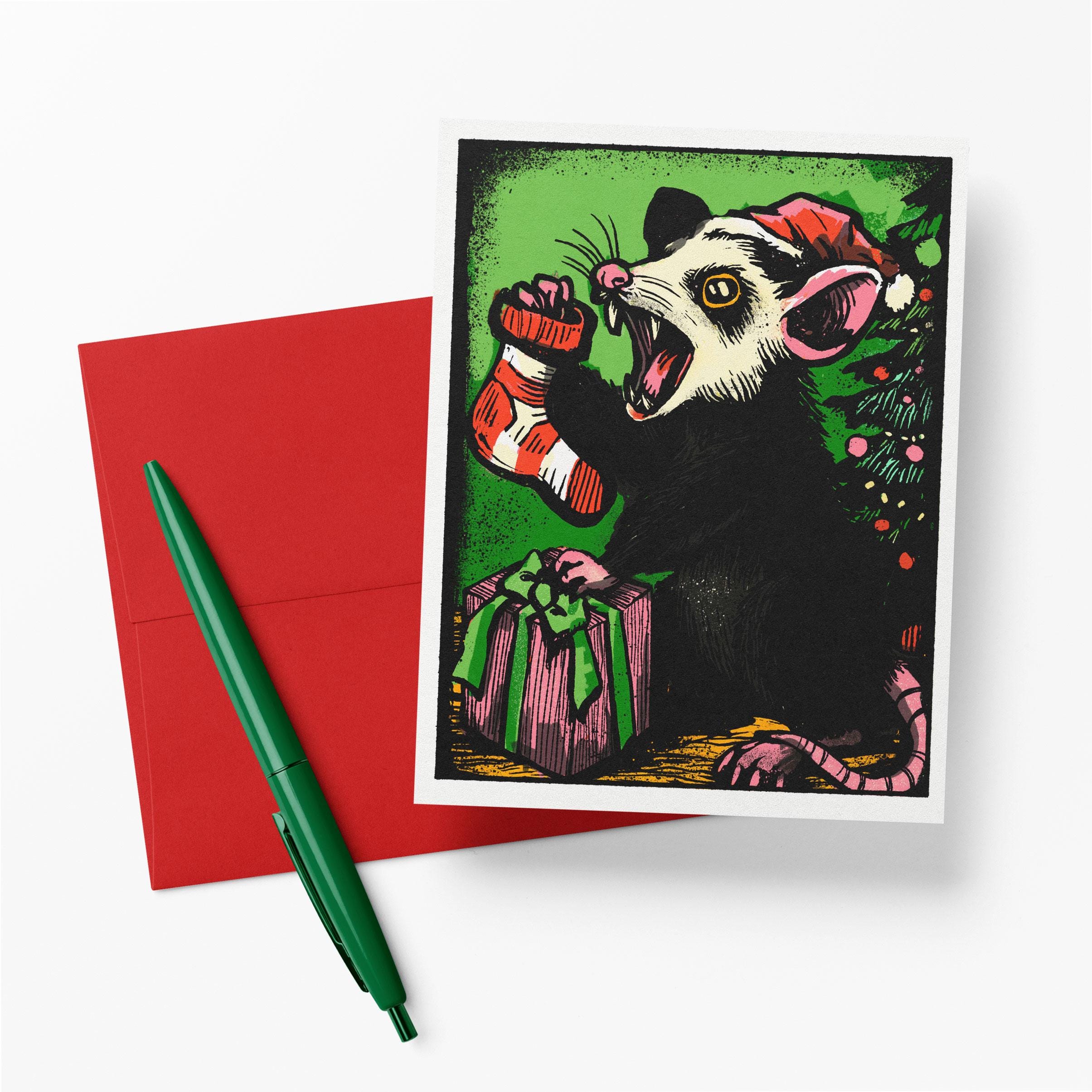 Seasons Screechings Notecard – Funny Possum Christmas Card, Dark Holiday Greeting, Blank Inside