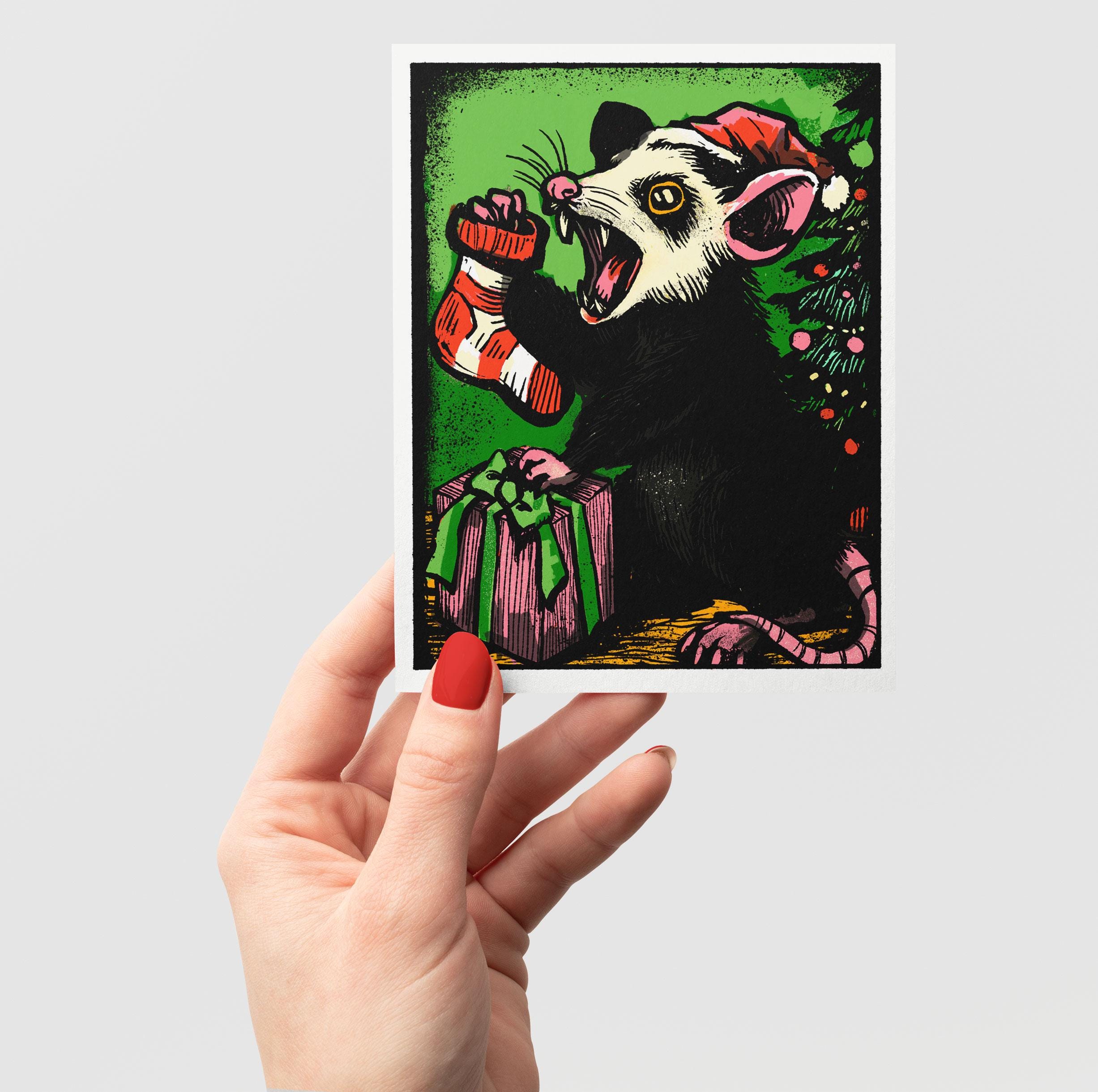 This is a notecard with a possum on it. The possum is screaming about Christmas. Sometimes Christmas makes me want to scream, too. I feel you, Possum.