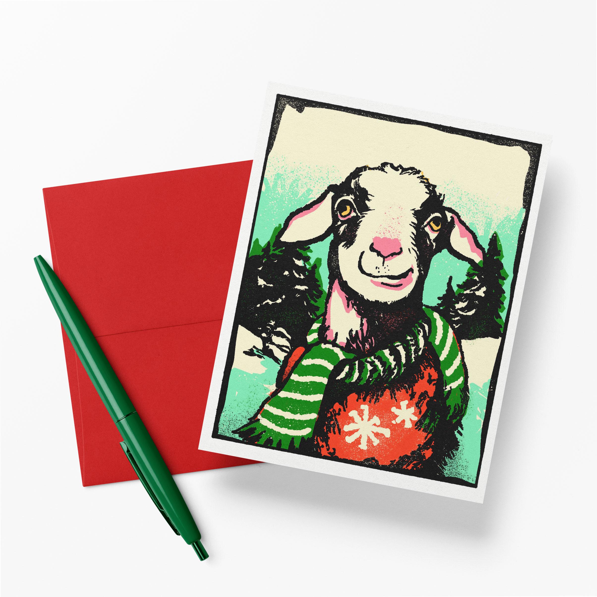 Holiday Goat Notecard – Funny Christmas Card, Farm Animal Greeting, Quirky Holiday Art, Blank Inside