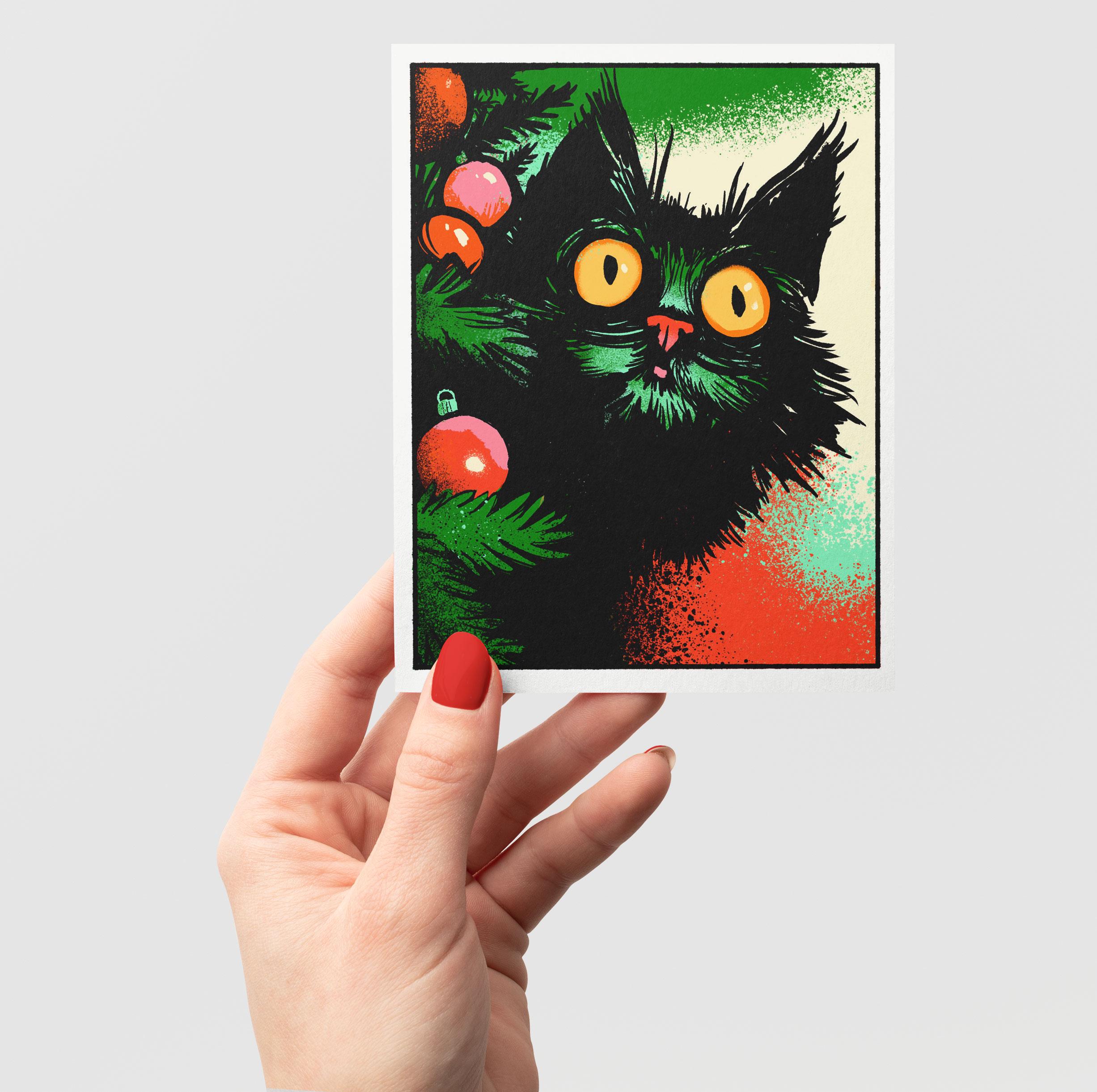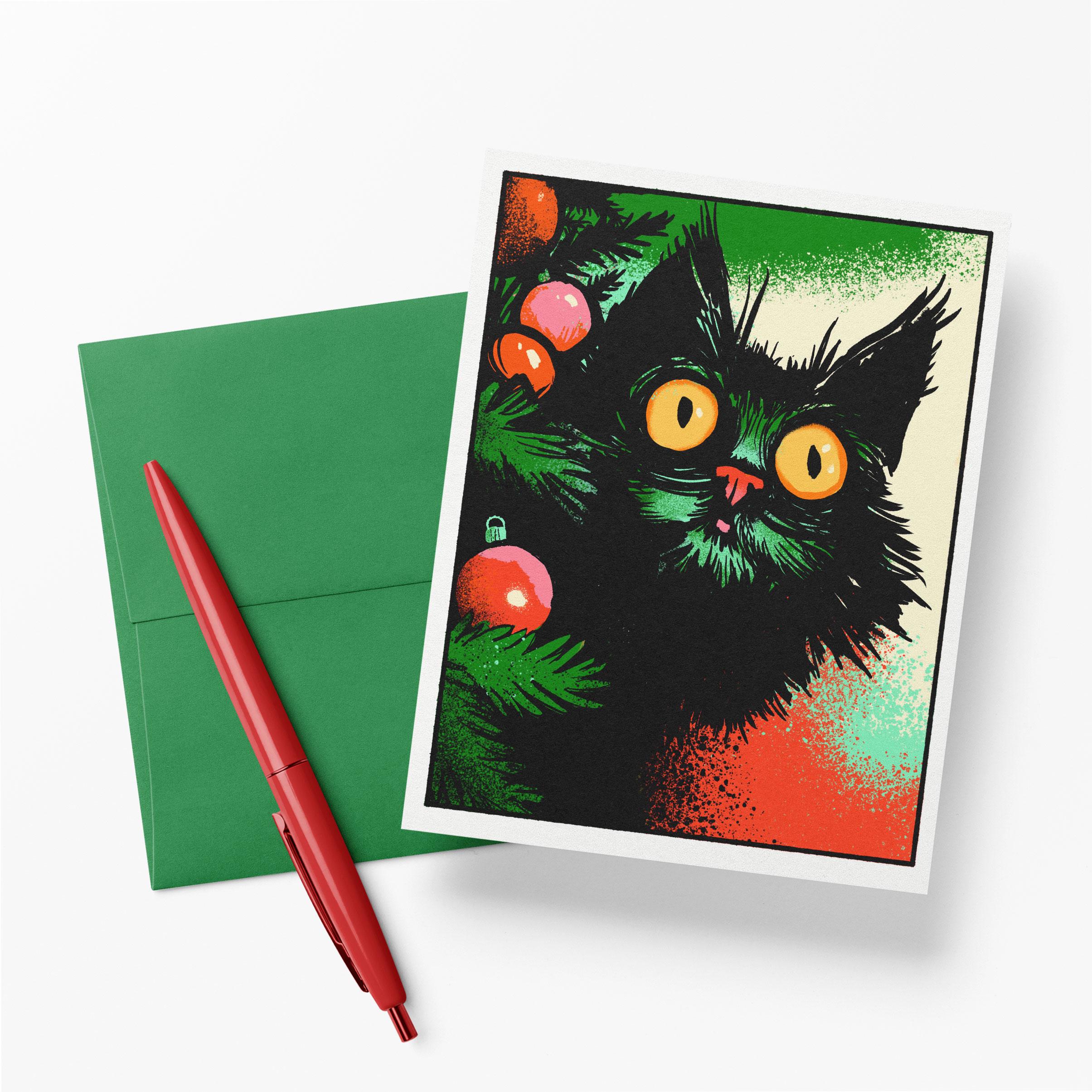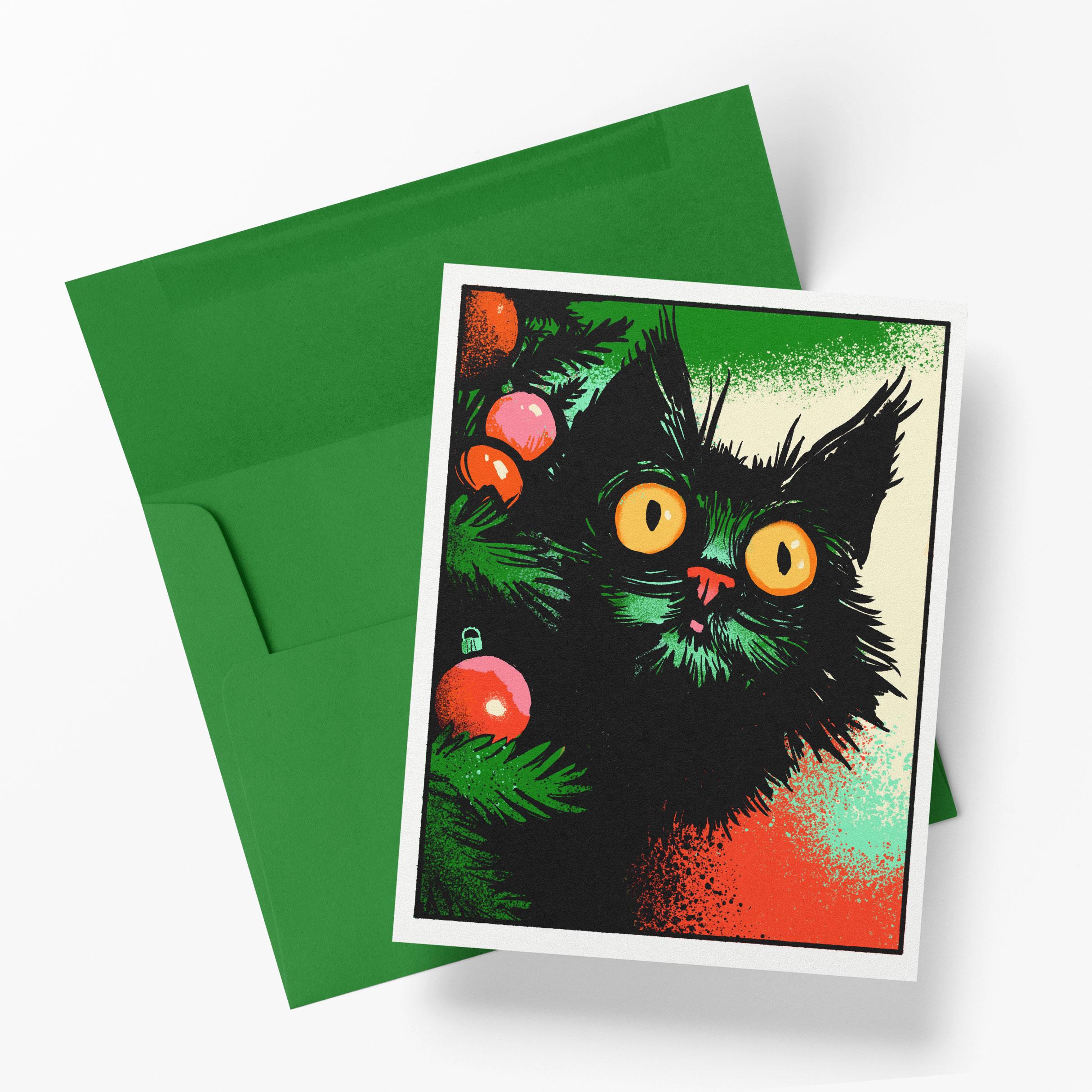 This is a notecard with a black cat on it. The cat has SEEN the Christmas tree. The tree doesn't stand a chance.